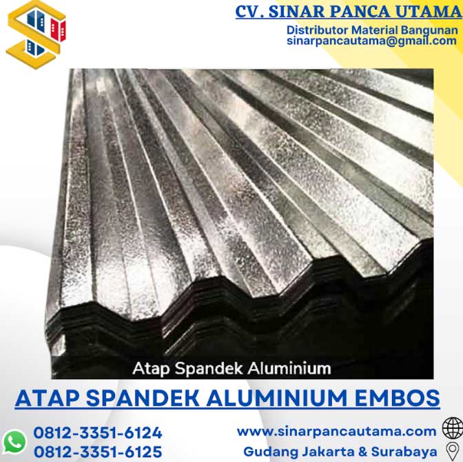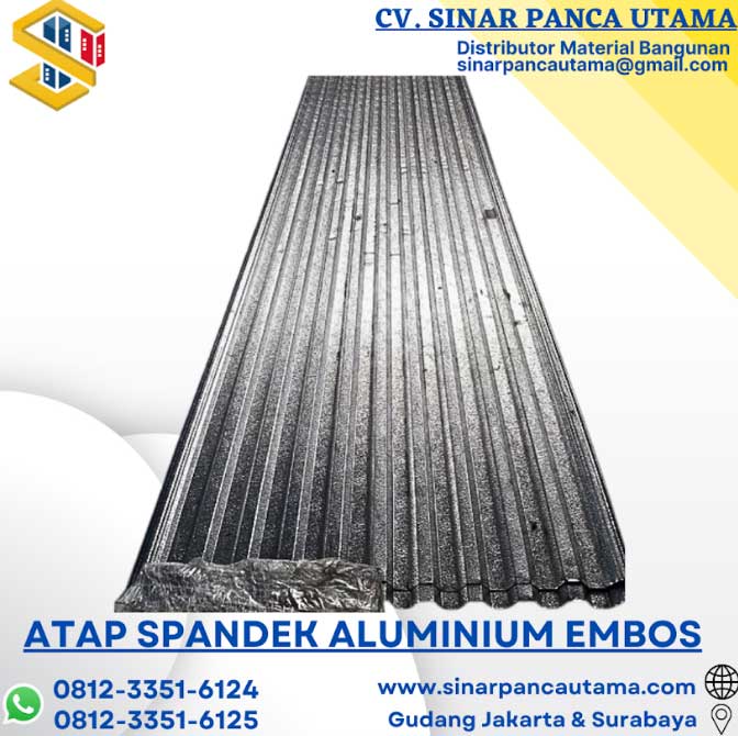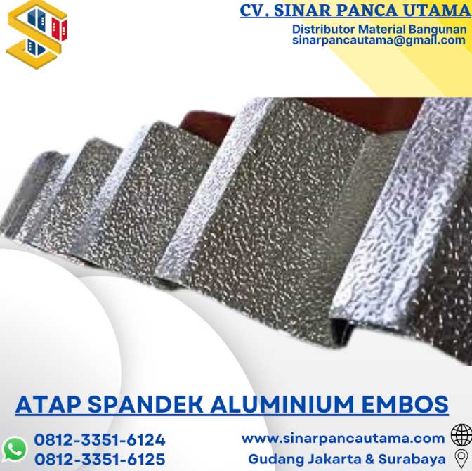 jenis atap premium yang terbuat dari bahan aluminium berkualitas tinggi dengan permukaan bertekstur emboss. Desain emboss pada permukaan atap ini memberikan estetika yang lebih menarik sekaligus meningkatkan kekuatan dan ketahanan terhadap cuaca. Atap ini ringan, tahan karat, dan memiliki sifat reflektif yang mampu menurunkan suhu di dalam bangunan, sehingga menjadi solusi ideal untuk bangunan perumahan, komersial, maupun industri.