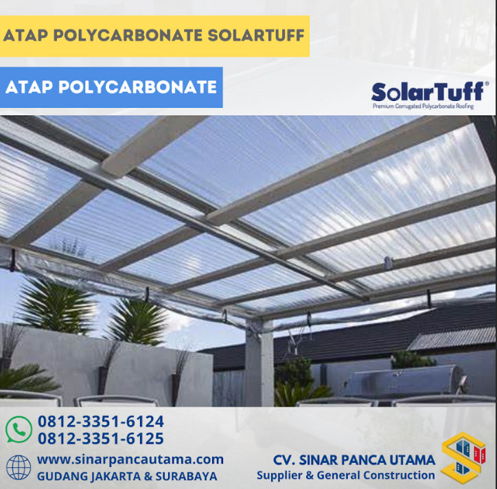 pilihan utama untuk atap yang memerlukan kekuatan, ketahanan, dan performa tinggi. Menggunakan teknologi polycarbonate terkini, Solartuff menawarkan solusi atap yang dirancang untuk bertahan dalam kondisi cuaca ekstrem sekaligus memberikan perlindungan dan pencahayaan alami yang optimal.
